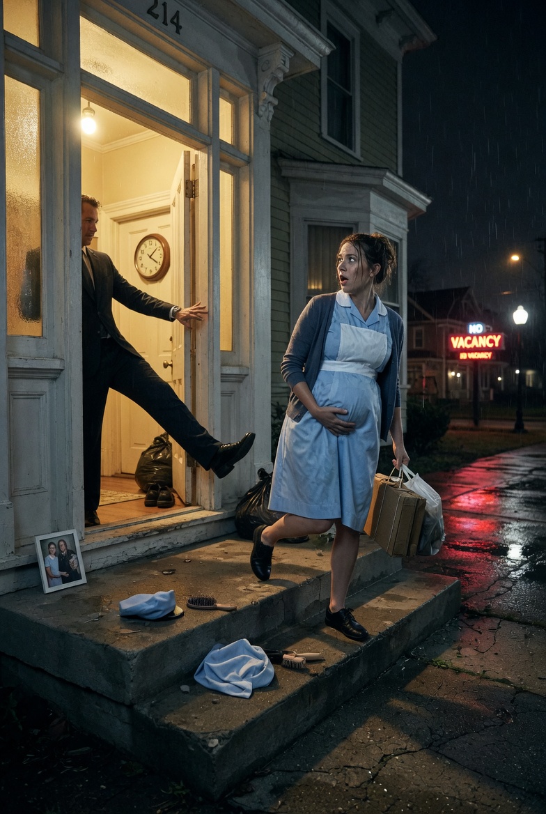 She blinked at him, trying to understand the sentence before she could survive it. The rain was loud enough to swallow small sounds, and for a second her own breathing seemed far away. “It is midnight,” she whispered. “Please. I have nowhere.”