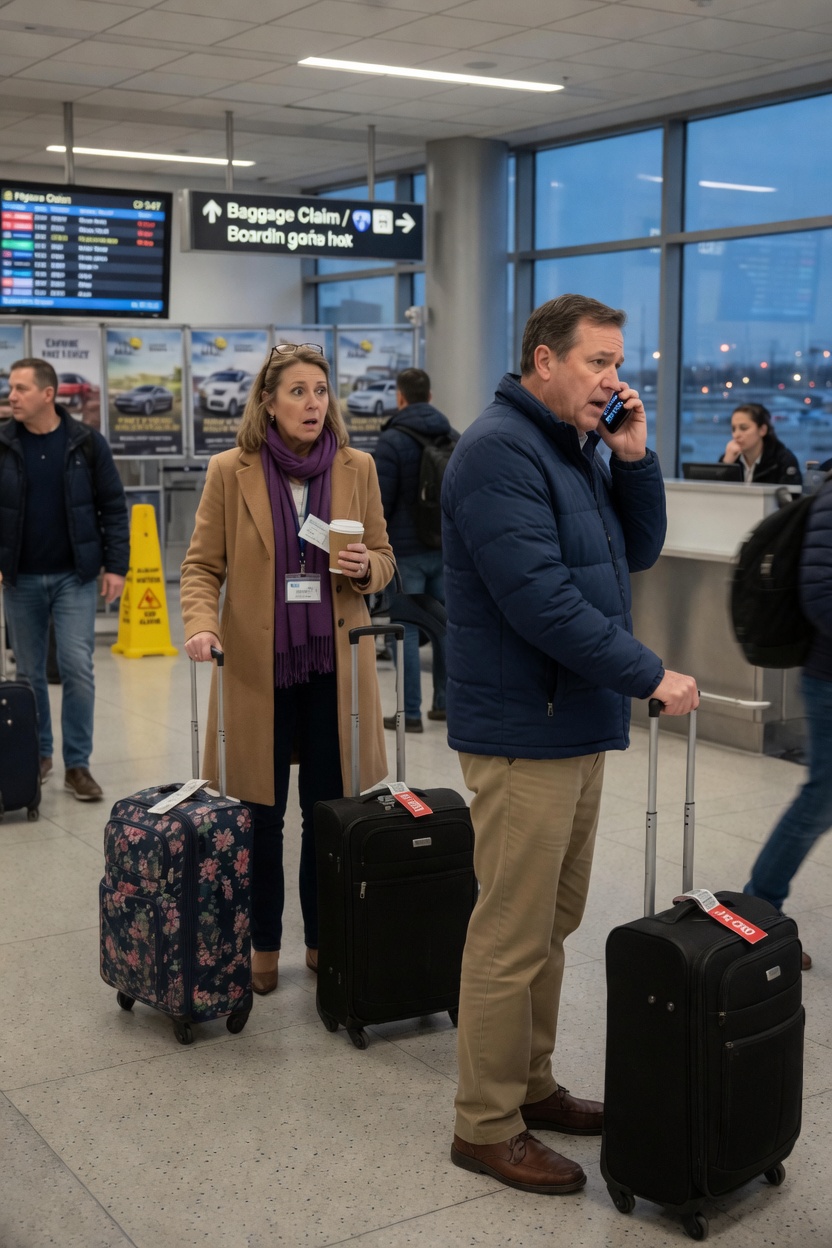 It came through Angela’s phone while she stood beneath the pale fluorescent lights of Terminal B, one hand wrapped around the telescoping handle of her burgundy suitcase, the other holding the warm rectangle of the device against her ear. Around her, the airport moved with its usual indifferent choreography: rolling luggage wheels ticking over tile seams, a child whining for a snack, the low drone of air conditioning pushing cold recycled air through the arrivals hall. Somewhere near the automatic doors, an espresso machine hissed, and the smell of burnt coffee and steamed milk floated above the crowd like something trying too hard to feel comforting.