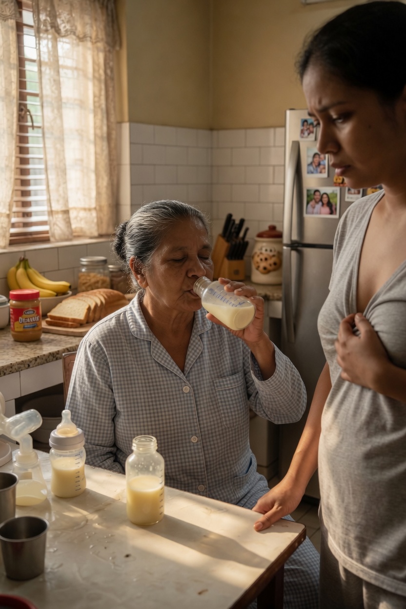 For a second, her mind refused to make sense of what she was seeing. The overhead bulb above the sink had a pale yellow cast, weak and tired, and in that light her mother-in-law stood near the refrigerator in a cream wrapper and loose blouse, head tipped back slightly, eyes half-closed, drinking from a white teacup with both hands. The house was quiet except for the low hum of the freezer and the thin, broken cry of Lara’s newborn upstairs. Then Lara saw the bottle on the counter, still warm from where she had just poured the breast milk she had pumped through a feverish, aching afternoon, and understood exactly what was in the cup.