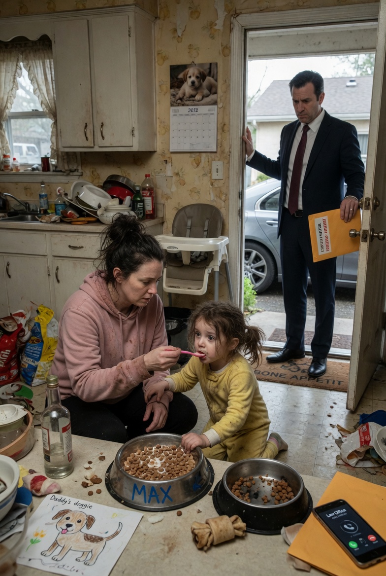 The ceramic bowl made a dry scraping sound across the kitchen tile, the kind of sound that set your teeth on edge even before you knew why. Delilah pushed it with the tip of one manicured finger, not looking at the child at first, only at the television murmuring from the family room and the reflection of herself in the darkened window over the sink. The bowl was chipped along the rim, beige with a faded blue stripe, and on the side, scratched into the glaze in a clumsy hand that had once belonged to a laughing man and a happy house, was a single name: Buster. Then Delilah lifted her eyes, cool and almost bored, and said, “Go ahead. Before it gets colder.”