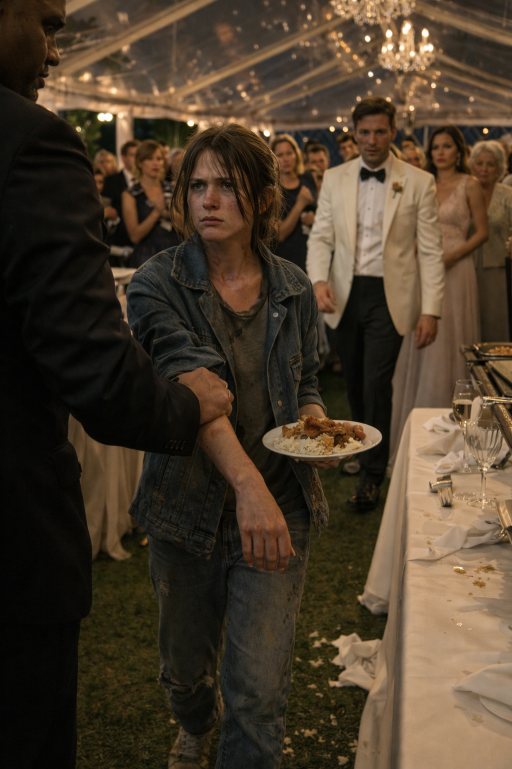 Naomi did not pull away. She stood still in the spill of warm light beneath the wedding tent, her shoulders narrow under a faded denim jacket that was too thin for the night, her hair pulled back with a frayed black elastic, her face all angles and shadows. She had the look of someone who had been underestimated so many times she had stopped finding it insulting. Her clothes were dirty. Her shoes were split at the soles. Her stomach had been cramping since noon.