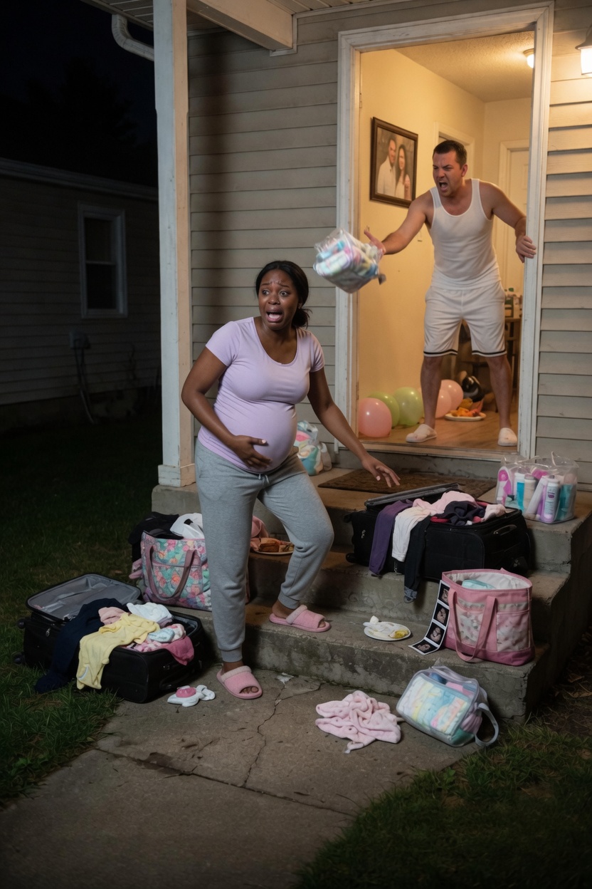 Nadine stood barefoot on the hot concrete, seven months pregnant, one hand hanging stiff at her side, the other brushing against the curve of her stomach as if instinct had moved faster than thought. The air smelled like cut grass, warm asphalt, and the sharp detergent scent rising from clothes packed too quickly into bags that were never meant to hold a person’s life. The June sun was high, pitiless, flattening everything in white light. She could feel a pebble pressing into the sole of her left foot. She did not move.