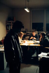 He heard movement outside and turned to see Priya, Miles, and Lena arriving together, balancing coffees and laptops and some pastry box already half opened. Miles knocked once on the glass and stepped in without waiting.