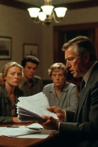 He sat at the far end of the conference table in a navy suit that fit too tightly across the stomach, his silver-framed glasses low on his nose, one neat stack of documents squared with the table’s edge as though grief could be managed by alignment. Rain tapped against the tall windows behind him. Somewhere in the hall outside, a copier whirred and stopped. Inside the room, the only sound was the old brass clock on the wall, ticking in dry, measured beats.