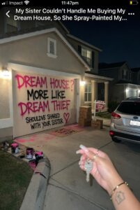 It was still glossy under the porch light, wet enough to catch and hold the glow, thick enough to drip in slow, ugly threads over the pale gray siding I had spent two weekends painting by hand the summer I moved in. The smell hit me a second later—chemical, sharp, unmistakable. Spray paint. New. Recent. My keys were still in my hand. I remember because the metal edges bit into my palm so hard they left little half-moon marks I noticed later in the bathroom mirror light while I was washing red paint dust off my fingers.