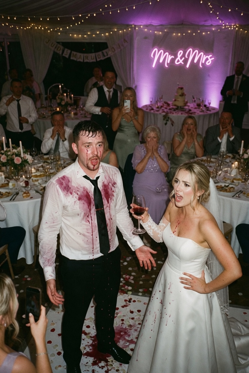 It came down in a thick red sheet over the front of his white tuxedo shirt, warm for half a second, then cold as the room inhaled all at once. Two hundred guests went silent so quickly the soft jazz from the corner speakers suddenly sounded obscene, like music still playing in a house after someone had died. Raymond Cole stayed seated at the head table, one hand still resting near his untouched champagne, and looked not at the stain spreading across his chest but at his bride.