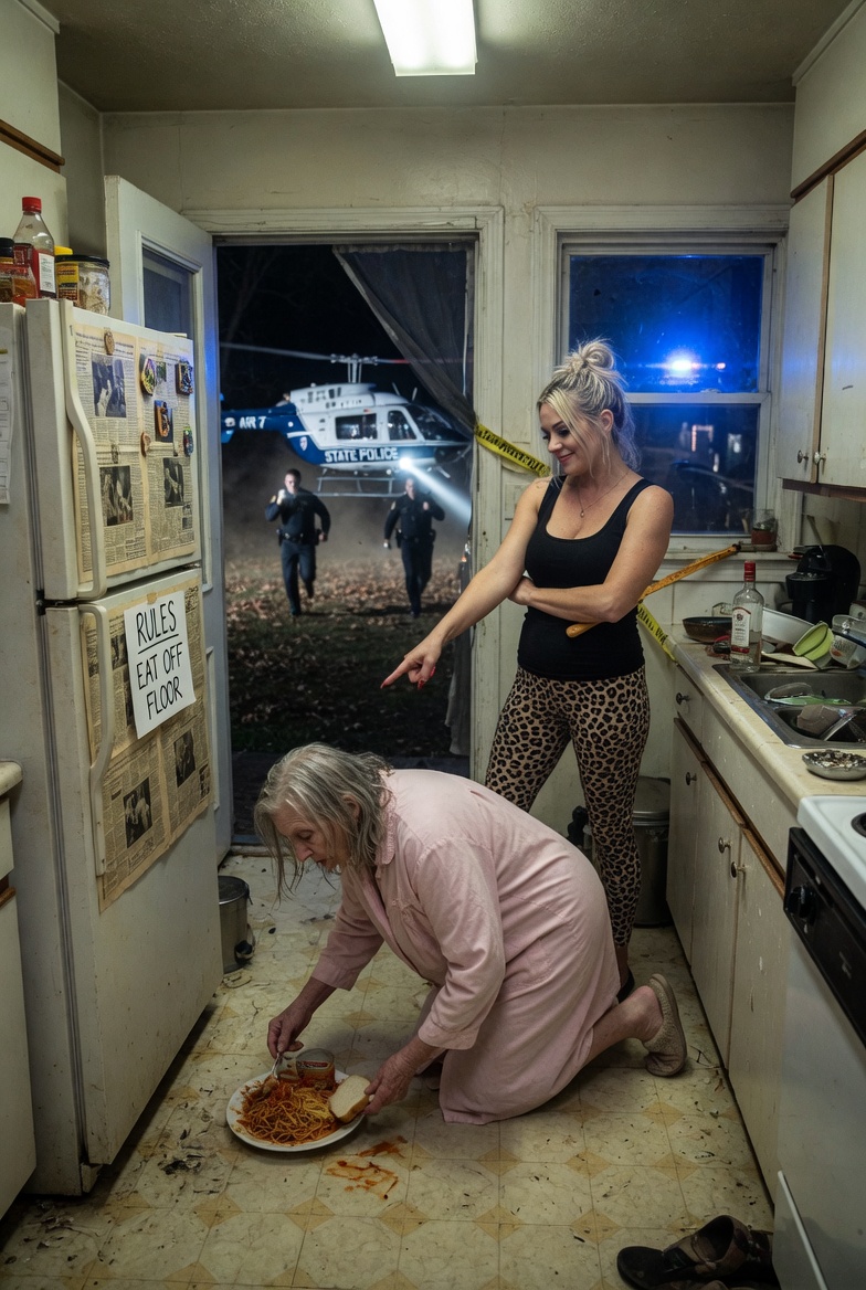 She rose slowly and followed the wall with one hand, as she often did on bad pain days. When she entered the kitchen, the plate was already waiting on the tile near the leg of a chair. Not on the table. Not even on the counter. On the floor. A small serving of rice. A spoonful of stew. One piece of chicken so small it looked almost theoretical.