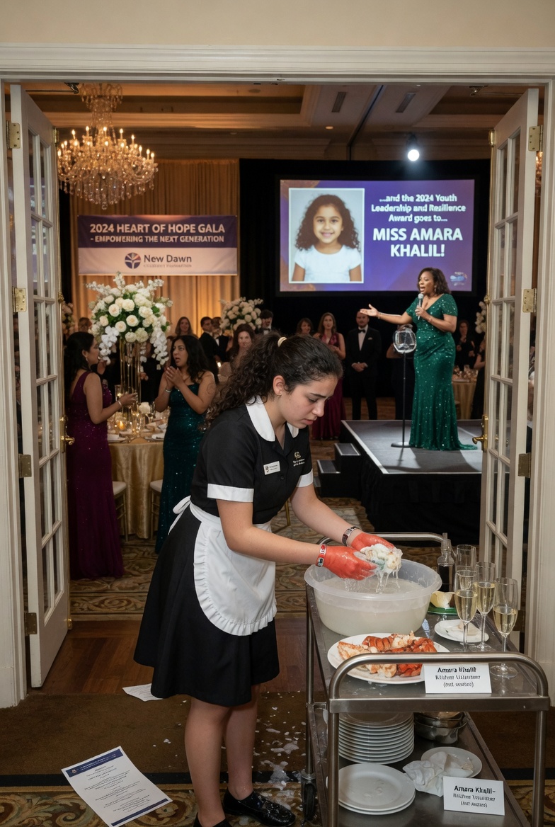 Her black flats made almost no sound on the thick carpet. Her dress, damp at the hem from kitchen water, clung slightly to the backs of her knees. The path between the tables felt too long and too exposed, a slow walk through other people’s certainty. Halfway down the aisle she saw Josephine near the VIP tables, headset lowered, clipboard gone from her hands. Josephine was not the kind of woman whose face usually revealed anything. Years had taught her how to wear competence like armor. But now her skin had gone pale under the ballroom lights, and something in her expression had collapsed into naked comprehension.