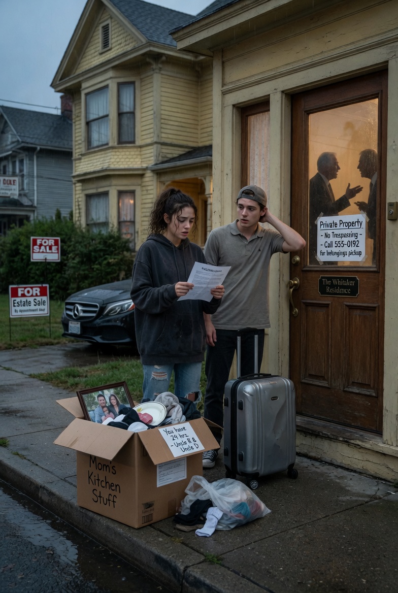The new brass deadbolt caught the late afternoon light in a hard, indifferent gleam. A moving truck was parked crooked in the driveway, its back doors open like a mouth. Two men in work boots were carrying out boxes from the front room—her father’s books, a lamp her stepmother had polished every Sunday, one of the dining chairs with the loose leg Jordan always promised to fix. The front yard smelled like damp grass and gasoline. Somewhere down the block, a dog barked behind a chain-link fence. Autumn stood at the bottom of the porch steps in the black dress she had worn to her stepmother’s burial, her heels sinking into the soft dirt, and for one suspended second the scene in front of her made so little sense that her mind refused to accept it.