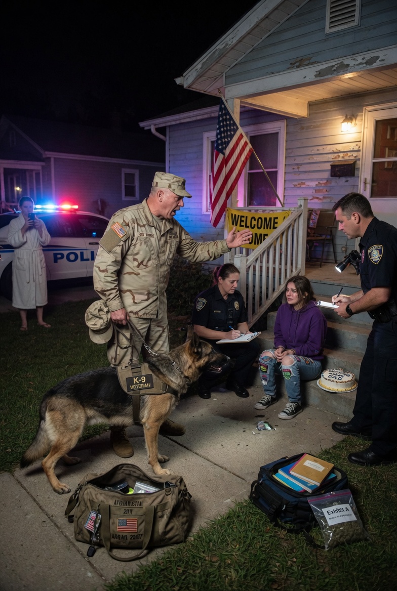 He was out of the truck before the engine died. Rex launched beside him, nails scraping the pavement, a low growl already building in his chest. Jack hit the porch with the force of a man who had spent years moving toward danger on instinct alone. The officer turned, broad and square-shouldered, one palm rising in warning, but Jack barely saw him. He saw the metal on Emily’s wrist. He saw the red indent around her skin. He saw the way she was trying not to sob because she knew crying made adults call her dramatic.