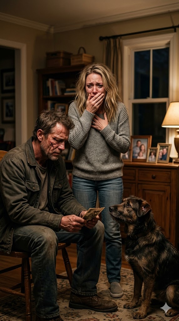 It happened so suddenly that the silence itself felt wrong. One moment Jonah was kneeling on the living room rug, lining up toy cars with the grave seriousness only children possess, telling her which one was the “dad car” and which one had “a broken wheel but still went.” The next, he was still as a photograph, his eyes fixed beyond the front window. Ellen followed his gaze and saw him standing across the street, just beyond the iron fence of the old Baxter house, with a dog at his knee and one hand tucked into the pocket of a dark coat. He wasn’t doing anything. He was only standing there. But the stillness around him had a pressure to it, as if the street itself had drawn a breath and held it.