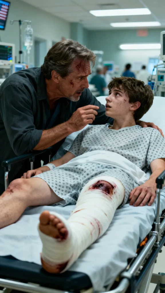 His hand tightened around mine with a strength that shouldn’t have been possible for someone in his condition. His eyes darted to the door behind me, then back to my face, and that’s when I realized: he wasn’t just in pain. He was afraid. Not of the leg. Not of the surgery he’d probably need, not of the recovery, not of any of the normal things a fifteen-year-old boy should be afraid of in a hospital.
