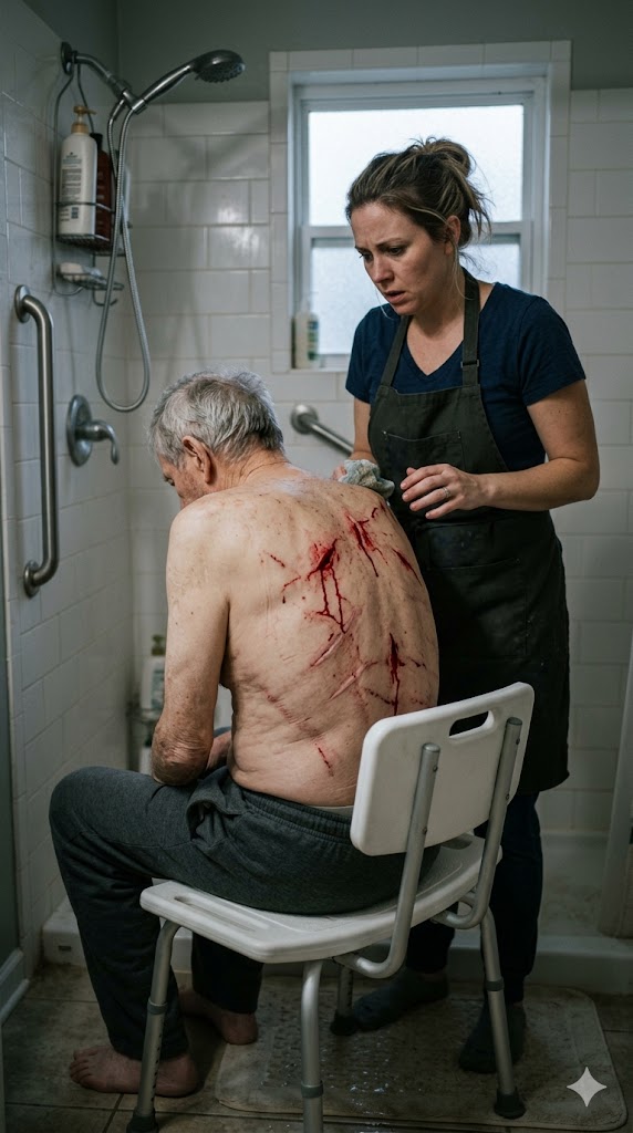 He looked at me in the mirror with the helpless, wounded dignity of a man who had once been broad-shouldered and loud enough to fill a room, and now needed his daughter-in-law to help him wash under his arms.