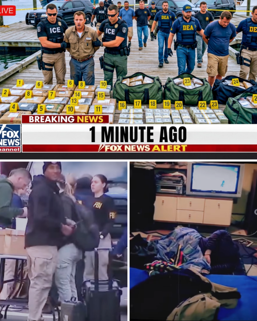 The fog rolls thick across Narragansett Bay, salt air mixing with diesel exhaust. Federal agents move through the darkness with practiced precision, their vehicles positioned at calculated intervals along the concrete pier. Red and blue strobes cut through the mist. Overhead, a Coast Guard helicopter maintains its position, searchlights sweeping across the water’s surface like a mechanical predator.
