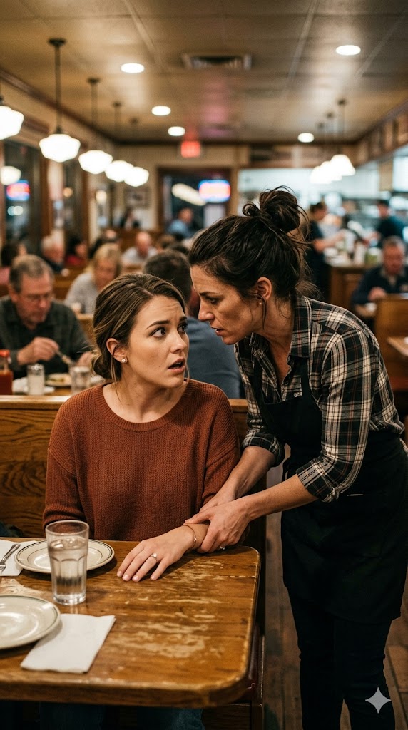 The waitress came to clear the plates before Eleanor could answer Patricia. She was in her late forties, maybe fifty, with dark hair pinned back too tightly and a face that looked plain until it turned toward the light. Then it became a face that had survived something. There was a pale mark near her jaw, the sort you noticed only after seeing it twice.