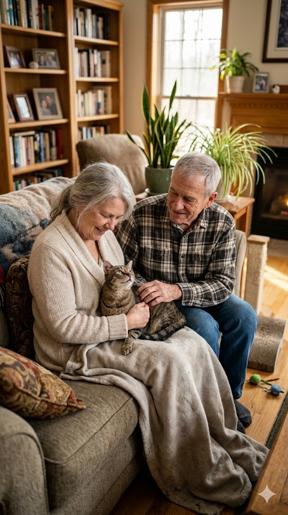 A big, old cat with a face gone silver around the muzzle, like someone had dusted him with powdered sugar. His eyes were cloudy at the edges. His movements had that stiff, careful rhythm like every step had to be negotiated with hips that didn’t want to cooperate anymore.