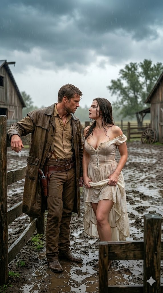 The man froze for half a heartbeat, his hands still tight on her arms, his gaze boring into hers from beneath the low brim of his hat. Rain dripped from his square jaw as he looked her over, his gray eyes as sharp and unforgiving as the storm clouds swirling above them. “Ma’am,” he rumbled, his voice a low vibration that seemed to carry more weight than the thunder. “Look at yourself. You’re already drowned.”