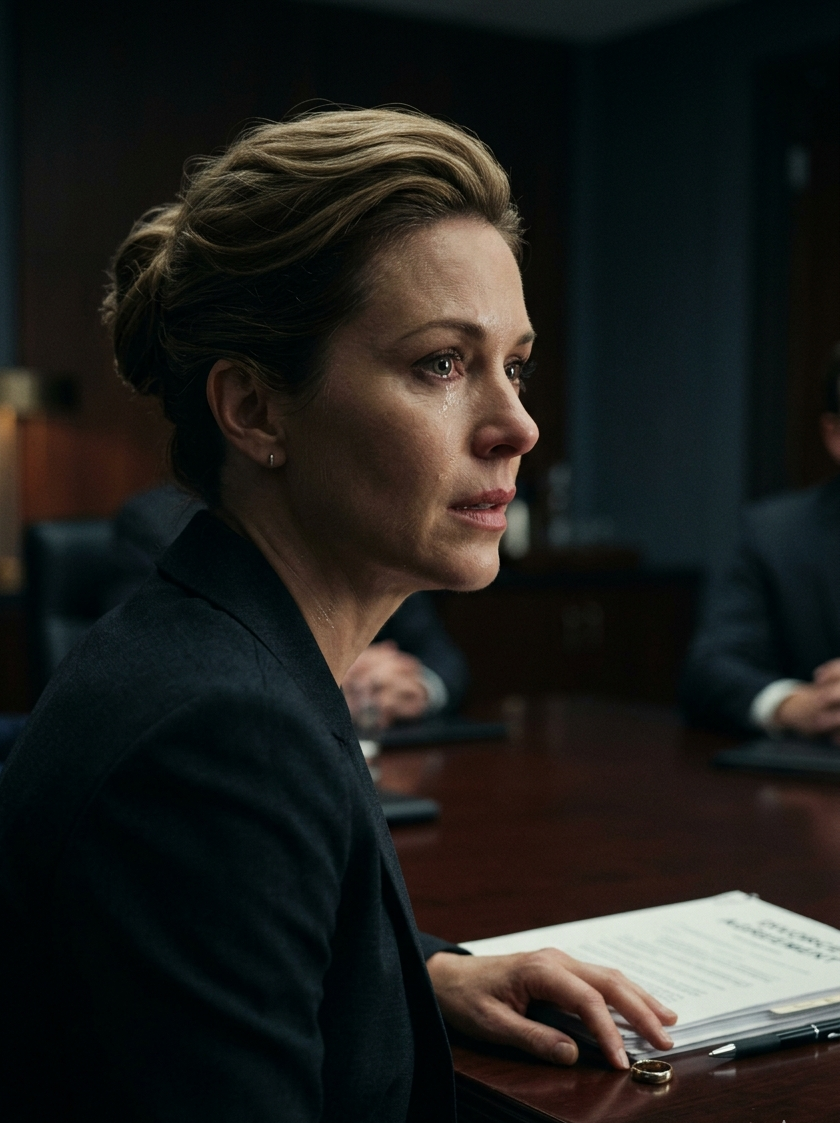 Thirty-one years of marriage in a navy dress, blue earrings, and a face turned just slightly away from him as if eye contact itself had become unnecessary. Her lawyer sat beside her, young, polished, expensive, and already relaxed in the way only certain people are relaxed—people who think the hard part is over.