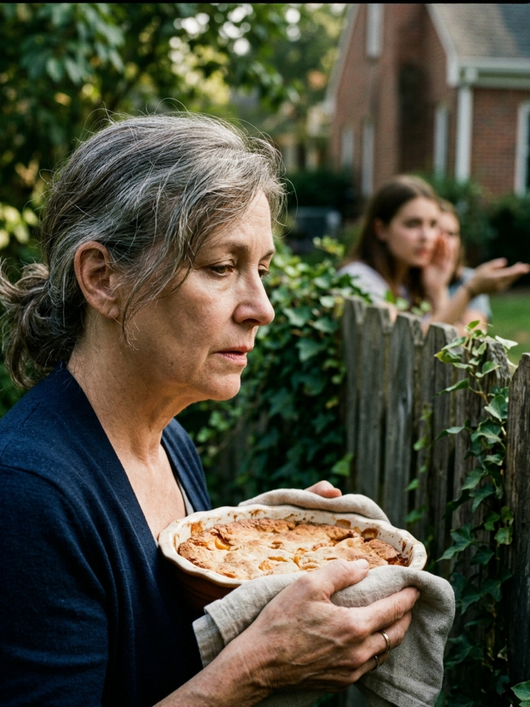 She stood there for one second too long, behind the wooden gate, a warm glass dish pressed into her palms.